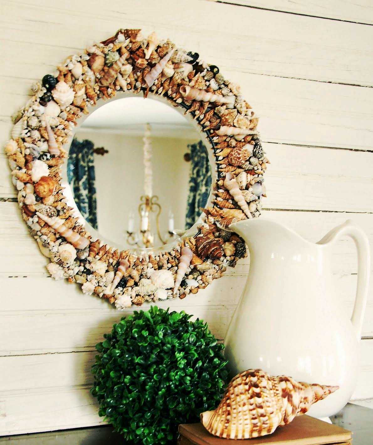 Красивая декорация зеркала не только будет прикрывать трещинки, но и интересно дополнит интерьер. Для этого можно использовать любые средства и материалы. Часто можно встретить способы декорирования при помощи ракушек. Они красиво смотрятся рядом с зеркальной поверхностью и придают ей особенное настроение.