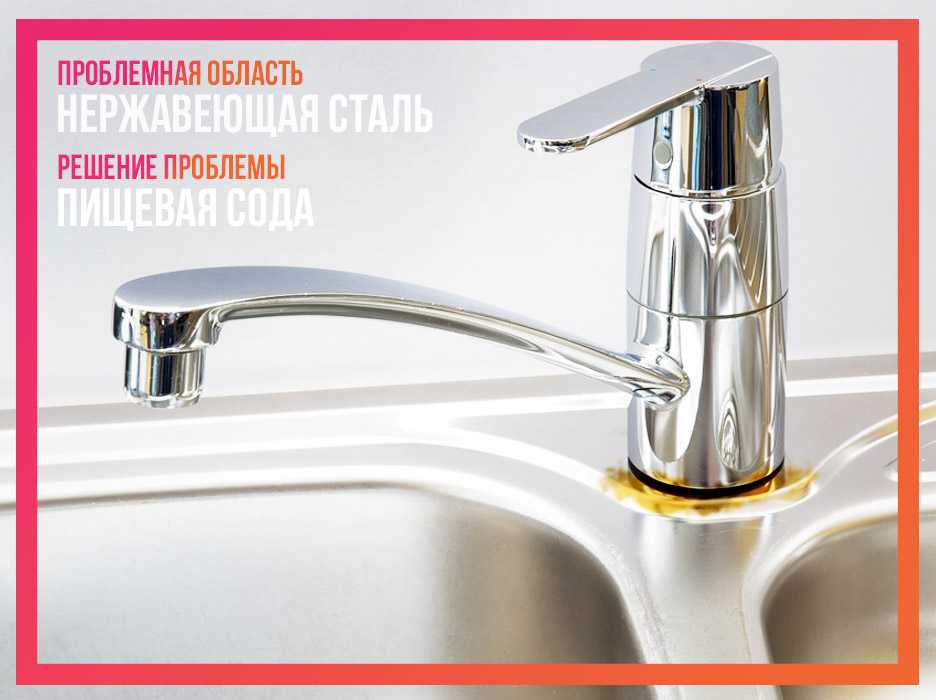 В то время как оксид хрома, покрывающий раковины и столешницы из нержавеющей стали, делает их более устойчивыми к ржавчине, чем традиционная сталь, само покрытие устойчивым к ней не является. Со временем оно может стираться, после чего пятна ржавчины появляются даже на нержавеющей стали. К счастью, обыкновенная пищевая сода способна удалить пятна ржавчины с нержавеющего металла; её мягкие абразивные свойства и щелочной pH позволяют убрать пятна и нейтрализовать любые кислоты со стальной поверхности, которые могут вызвать ржавление.