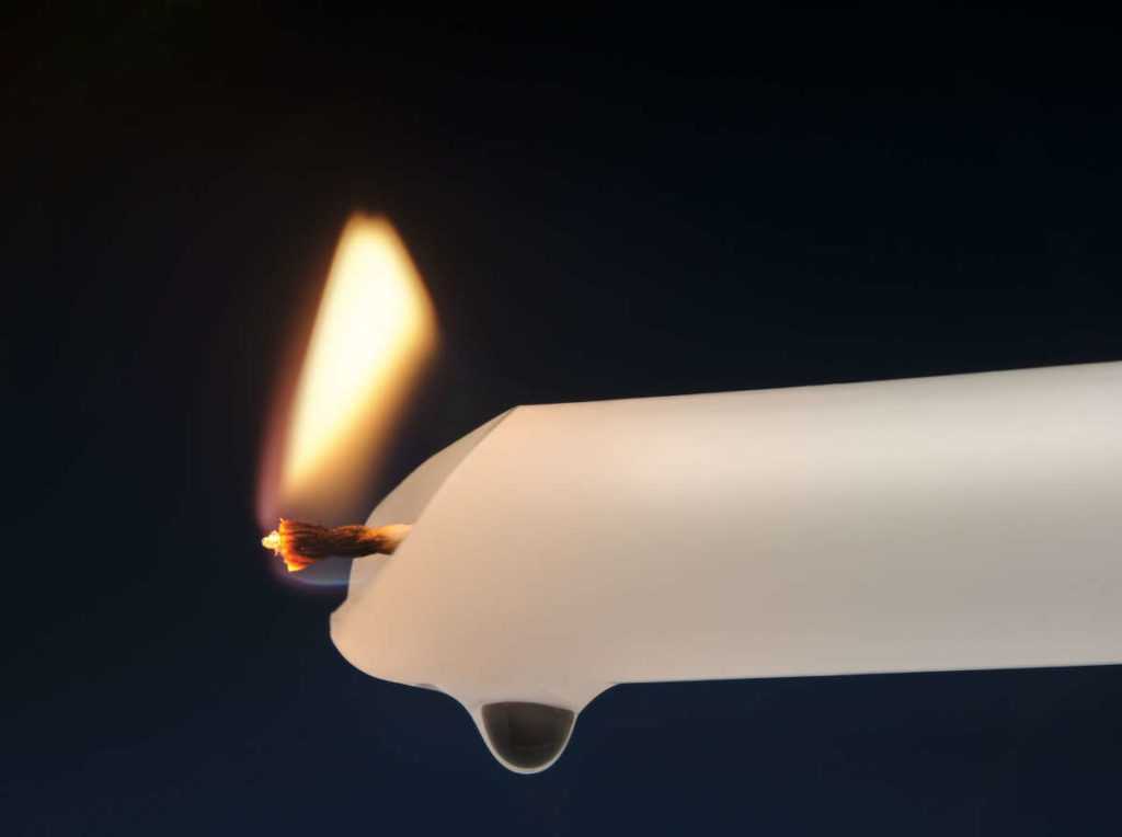 Для производства изделий используют парафин с добавками. При попадании на одежду расплавленная свеча оставляет пятно, проникающее внутрь волокон, быстро застывающее на поверхности. Состав водоотталкивающий, который удалить при простой стирке не получится, придется применить домашний арсенал средств.