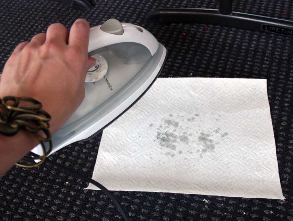 - Через них аккуратно проглаживать загрязнение раскалённым агрегатом. Благодаря таким манипуляциям воск впитается в салфетку.