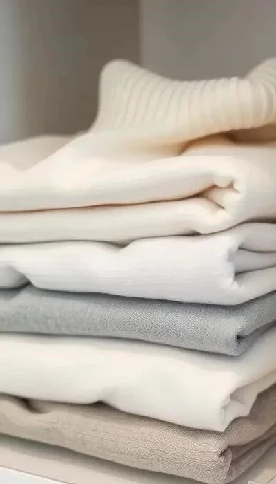 - Шерсть и вязаные изделия (свитеры, джемперы): Перед хранением тщательно постирайте и просушите. Эти материалы боятся растяжения и моли. Храните только горизонтально, аккуратно сложив по швам на полке, чтобы воротник не вытянулся.
