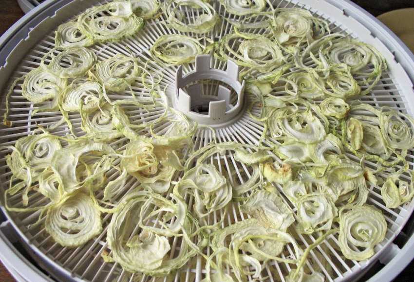 Этот способ позволяет сохранить максимум пользы, а также его преимуществом является удобство хранения. Сушёный лук можно хранить в течение длительного времени, кроме того, объём продукта уменьшается в 10–15 раз, что позволяет его складывать в достаточно компактную тару.