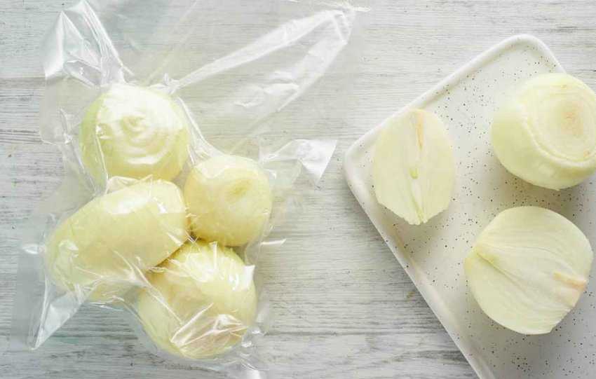 Прежде чем закатывать лук в пленку, нужно выдержать его в холодильнике. Туда же для охлаждения помещают сам пакет. Если они будут одной температуры, конденсата образуется намного меньше.