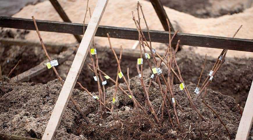 В открытом грунте черенки помещают в неглубокую (до 20 см) траншею, предварительно обработав срезы и связав посадочный материал в пучки по сортам. Каждый пучок обернуть мешковиной или другой плотной натуральной тканью.