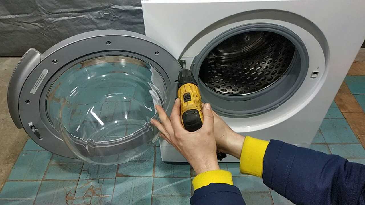 Бытовая стиральная техника LG отличается сложной конструкцией. Чтобы снять фронтальную панель, придется сначала отверткой выкрутить гайки, надежно фиксирующие крышку люка. Затем предстоит аккуратно убрать винт, крепко стягивающий хомут для удержания манжеты.