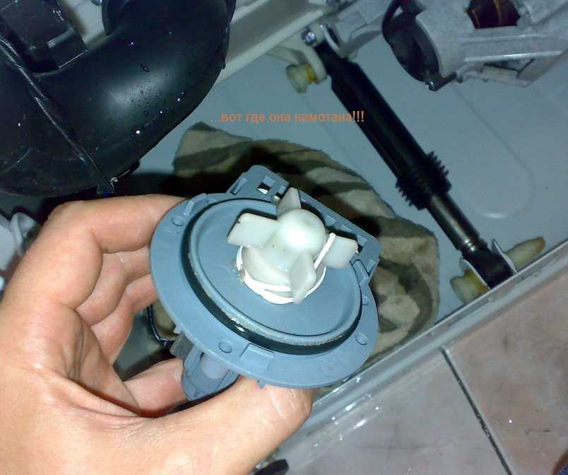 - Если крыльчатка не вращается, нужно полностью проверять насос. Находится он рядом со сливным патрубком.
