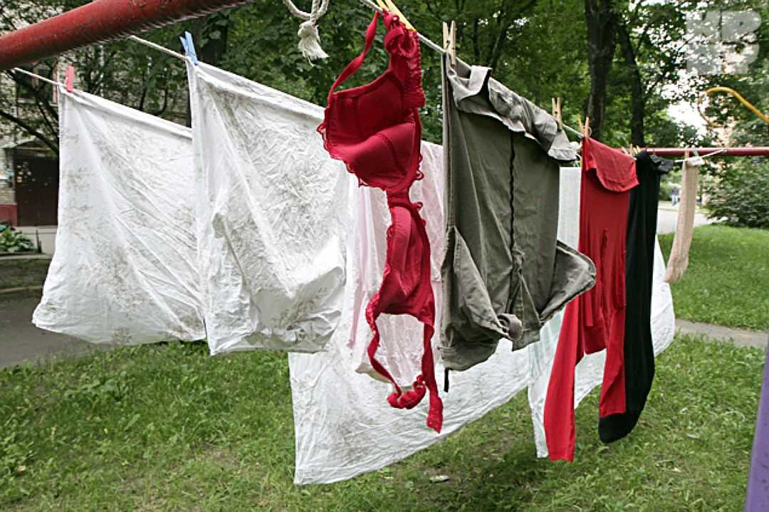 - Для начала вынесите всю одежду на балкон и развесьте ее на солнце, вывернув наизнанку, чтобы она не выгорела.