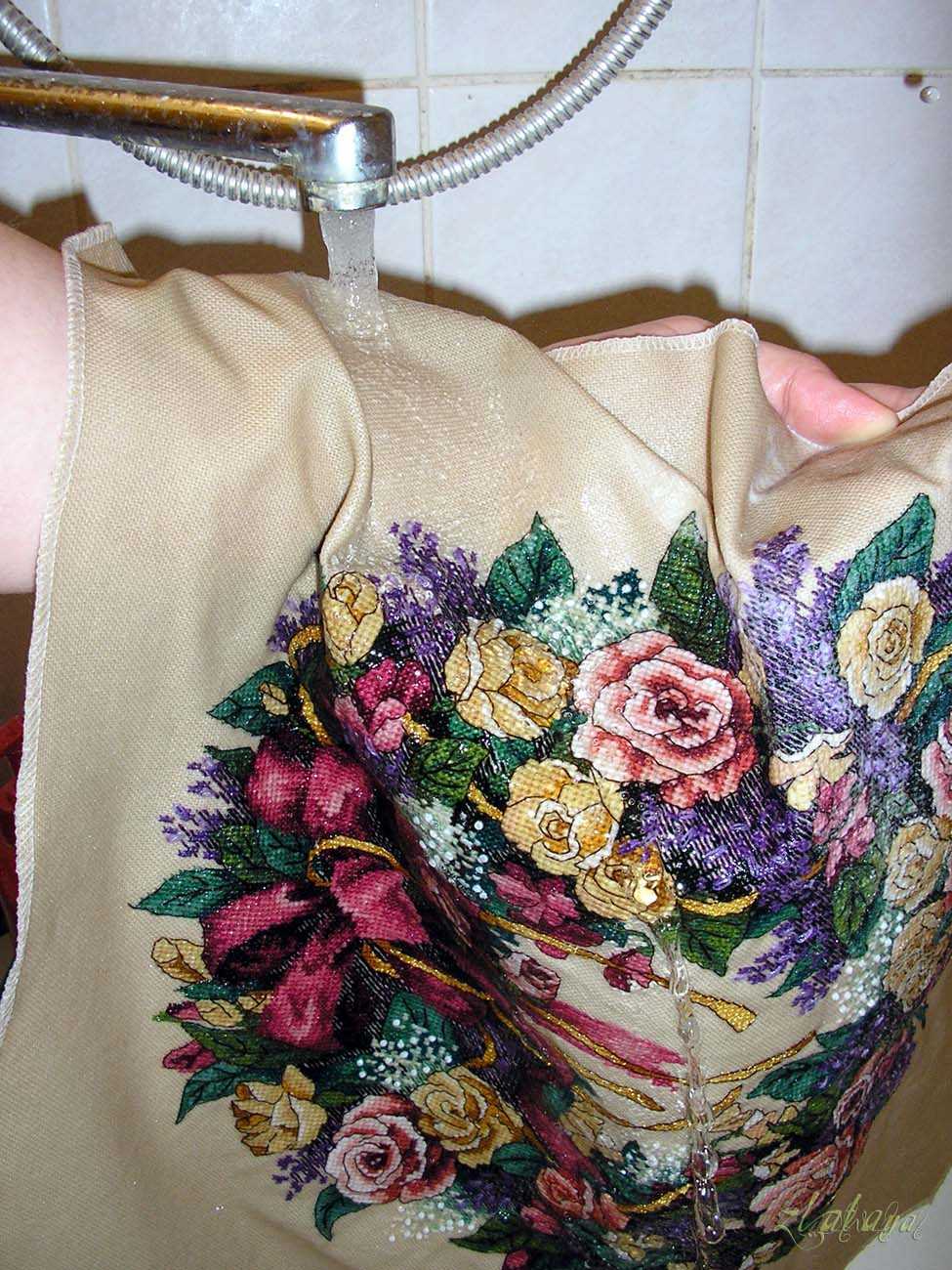Если строго следовать основным правилам влажной обработки, вышитый аксессуар сохранит свой первозданный вид. Процедура состоит из нескольких этапов:
