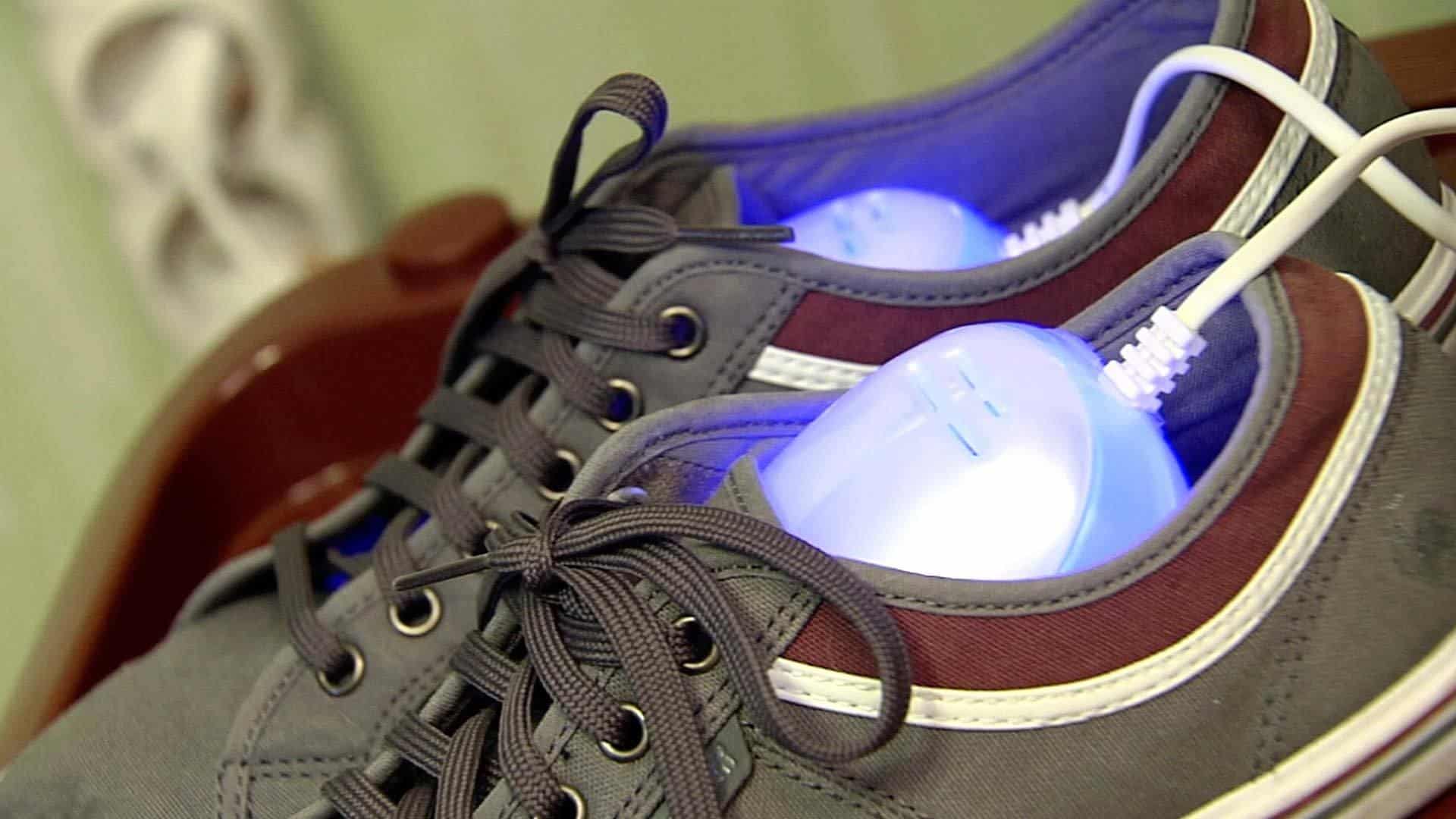 - Электросушилка. Прибор в виде обувной колодки деликатно и эффективно просушивает обувь. Есть размеры для взрослой и детской обуви. Особенно полезна ультрафиолетовая сушилка – она ещё дезинфицирует обувь.