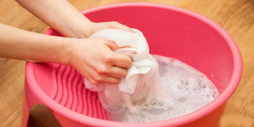 Стирка вручную — это самый лучший вариант чистки одежды из 100% льна. Качество и бережность процесса стирки в первую очередь зависит от моющего средства. В его составе должно быть достаточно щелочного вещества, такого как сода или силикаты. Это не только смягчит воду, но и поможет вывести пятна. Естественно, в порошке не должно быть хлора. А для цветной ткани лучше приобрести средство, предназначенное для тонких изделий.